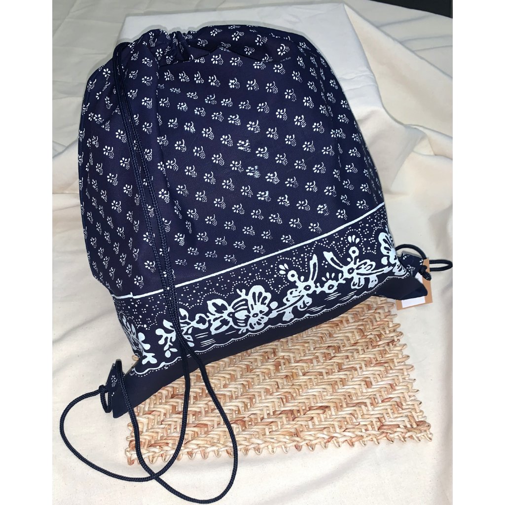 látka je z druhé strany indigově modrá s nepravidelnými světlými skvrnami zapříčiněnými prosáknutím krycí hmoty s lícové strany