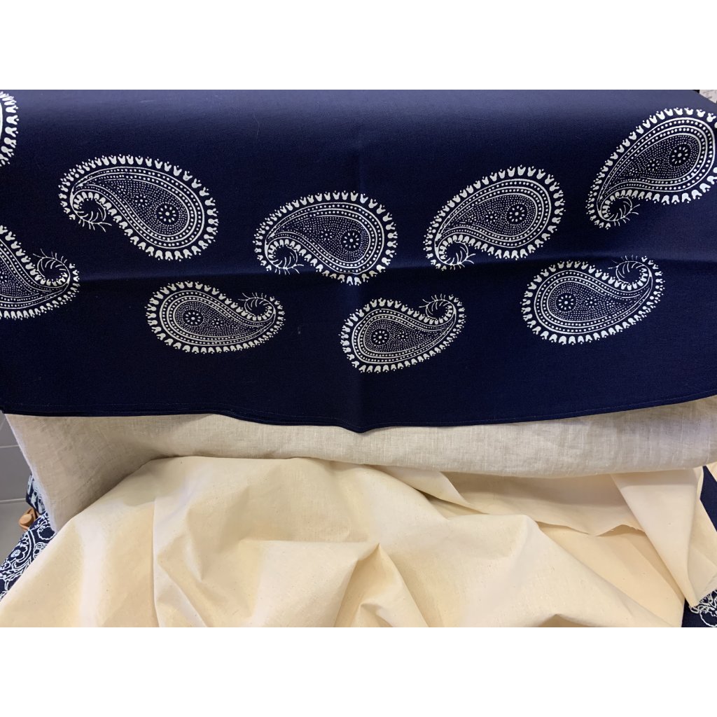 látka je z druhé strany indigově modrá s nepravidelnými světlými skvrnami zapříčiněnými prosáknutím krycí hmoty s lícové strany